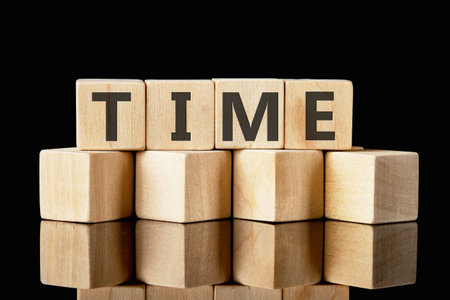 BUSINESS concept. TIME word letters on assembled from wooden cubes on a glossy black background