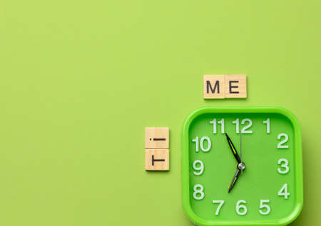 square green alarm clock on a green background and the inscription time from wooden blocks