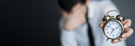 man holding clock watch, hiding, checking time on clock, running late to work, being in delay, deadline.