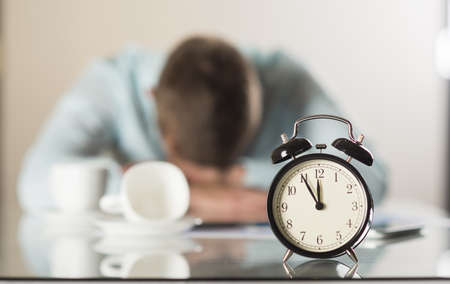 Young tired overworked employee freelancer sleeping at work hugging clock sitting at desk front of laptop computer. Studio shot face portrait. Office late working overtime at night concept