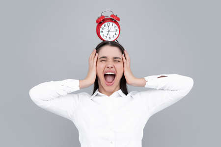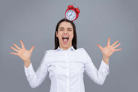 Photo of shocked girl hold alarm clock, crazy girl isolated gray background.