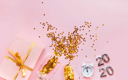 Flatlay New Year composition on a pastel pink background. Glasses with champagne, confetti. 2020.