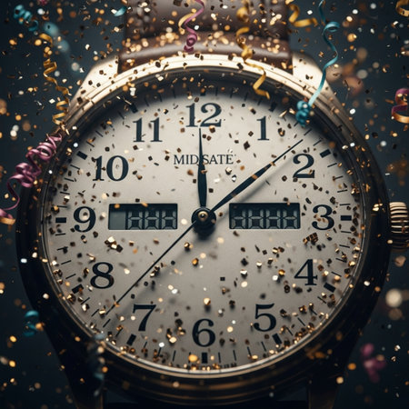 A festive New Years Eve scene featuring a large clock, golden ornaments, gift boxes, and fireworks, symbolizing the countdown to midnight.