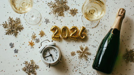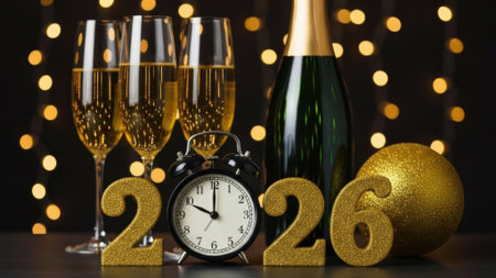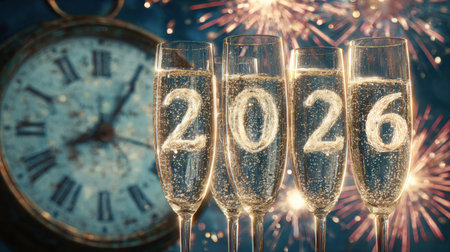 Festive image featuring champagne glasses, a clock, and the year 2026, perfect for New Years Eve celebrations.