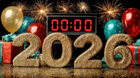 A festive New Years Eve celebration featuring the year 2026 in large glittery numbers, a digital clock showing midnight, fireworks, balloons, and gift boxes.