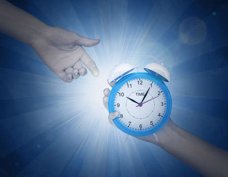 Wake up and get up, its time to act, concept. Clock and alarm clock, attention its time to do. A mans hand holds a vintage alarm clock, a photo on a blue background