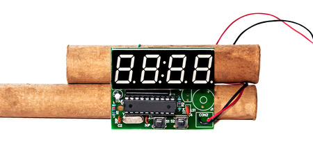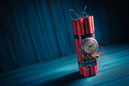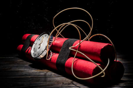 Image of a time bomb against dark background. Timer counting down to detonation illuminated in a shaft light shining through the darkness, conceptual image