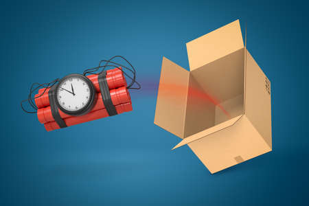 3d rendering dynamite bundle with timer bomb flying out of cardboard box, suspended in air on blue background.