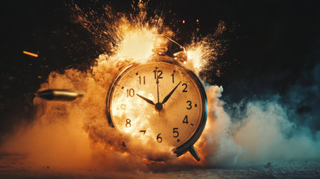 Dynamic image of an alarm clock exploding as a bullet crashes through its center, set against a dark background