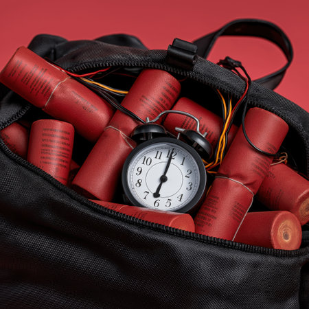 A stark image capturing a makeshift explosive device, consisting of numerous red dynamite sticks and a black ticking alarm clock, hidden inside an open black bag, symbolizing an imminent threat.
