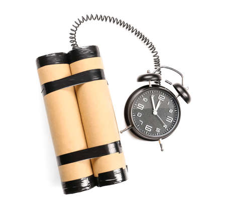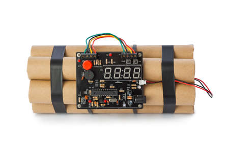 Dynamite sticks with time igniter. Explosive material with ignition connected to a mobile phone. White background.
