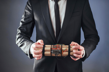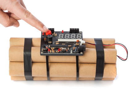 Terrorist is holding home made bomb with cables and remote controled detonator. Preparation for terrorist acts.