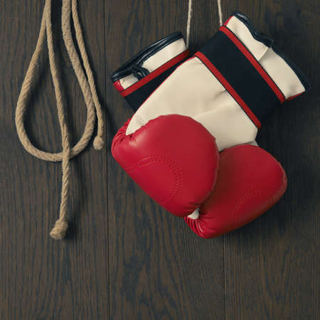 Pair of leather boxing gloves on wooden background. Red and blue boxing glove symbolized of against competitor.