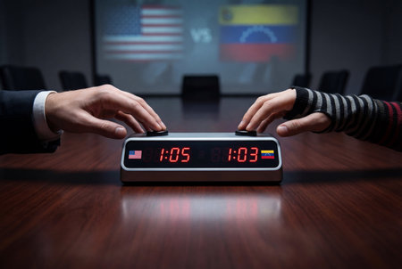 Hands of negotiators operate a digital timer displaying united states and venezuela flags on a wooden table to symbolize urgent diplomatic discussions or trade conflicts.