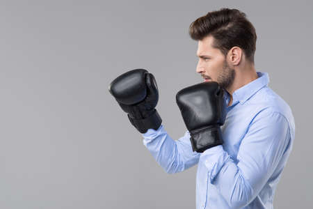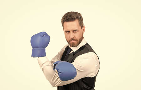 I will fight. Manager in boxing position. Professional man in boxing gloves. Keep fighting