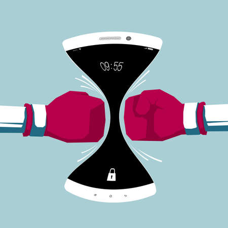 on a pink background two boxing gloves of blue color in the form of a heart with a phone in hands