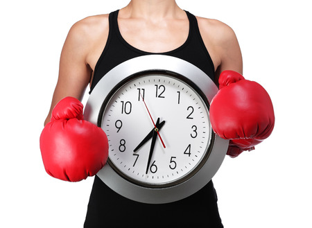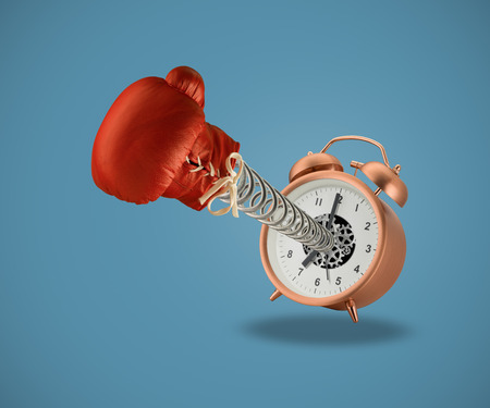 An illustration depicts a clock with boxing gloves attacking a calendar labeled Deadlines. The scene features a busy office desk strewn with papers and a desk lamp. The cartoon-style image uses bold lines, vibrant colors, and dynamic composition, suitable for various editorial and commercial applications.