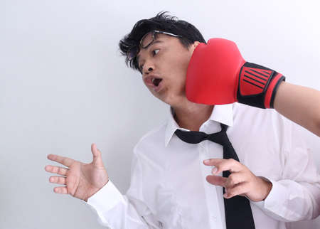Business competition concept, businessman knocked out by getting punched in his face with red boxing gloves on white background.