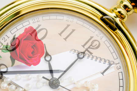 Vintage pocket watch with red rose and blank diary background. Time of love concept.