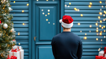 Christmas and New Year. Cheerful young man in a sweater and Santa Claus hat celebrates Christmas at home. Beautiful x-mas decorations.