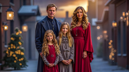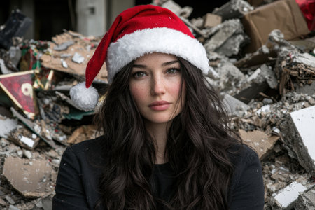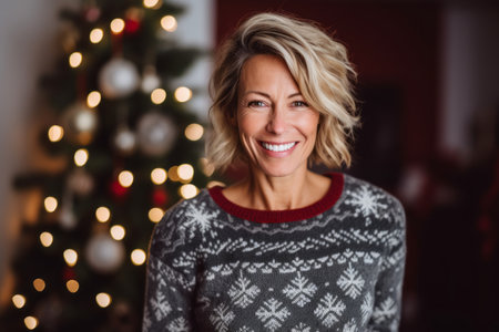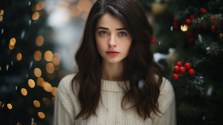 Woman in cozy outfit, surrounded by festive decorations, winter theme