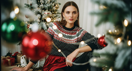 A woman in a festive sweater sitting near a decorated Christmas tree, surrounded by holiday ornaments and gifts