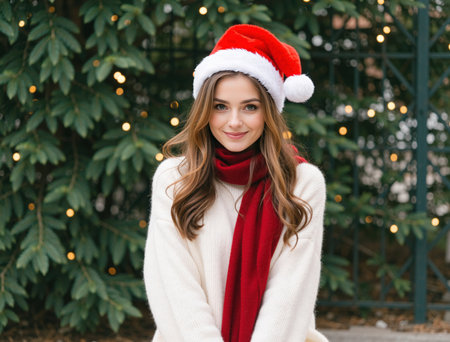 Young woman wearing a santa hat and red scarf, smiling for a portrait with festive christmas lights and evergreen trees in the background, celebrating the holiday season