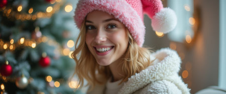 A cheerful young woman with a radiant smile wears a fluffy pink Santa hat, sitting cozily near a beautifully decorated Christmas tree. The warm glow of twinkling lights and colorful ornaments creates a magical holiday atmosphere, highlighting her joyful spirit and the essence of festive cheer.