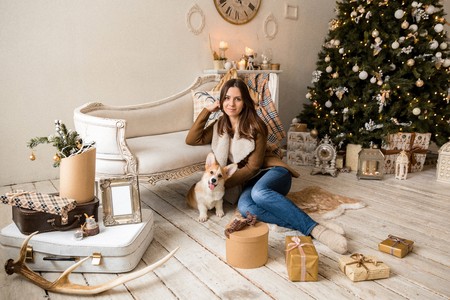 a girl in a warm jacket sitting in front of the sofa and playing with a puppy Welsh Corgi Cardigan, considering gifts