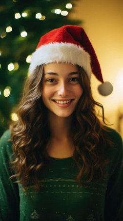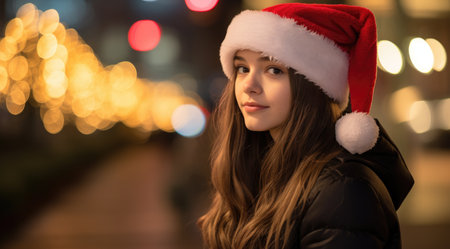 A joyful young woman wearing a Santa hat smiles brightly in front of shimmering bokeh lights, perfectly embodying the festive spirit and warmth of the holiday season.