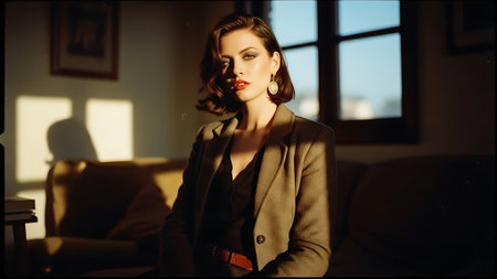 A stylish woman in a beige blazer and satin top, posing confidently in front of a large softbox light, with a modern interior background