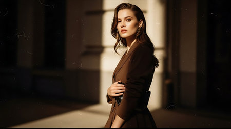 Beautiful young brunette woman in a brown coat, posing on the street.