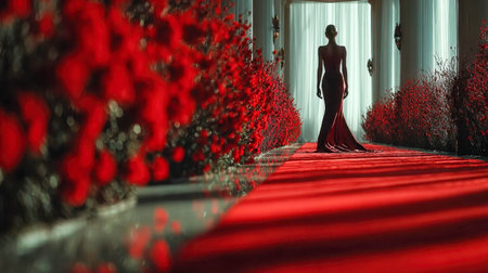 Elegant fashion model in a designer gown walking on the red carpet under bright lights at a glamorous celebrity event.