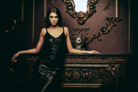 Portrait of an attractive young woman in tight black dress in a luxury apartment. Classic vintage interior. Beauty, fashion.