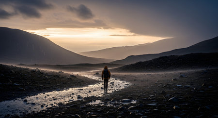 A lone hiker with a backpack walks away through a shallow stream in a rocky mountain valley. Rain falls against the dramatic light of a sunset breaking through stormy clouds, creating a moody, adventurous, and atmospheric silhouette.