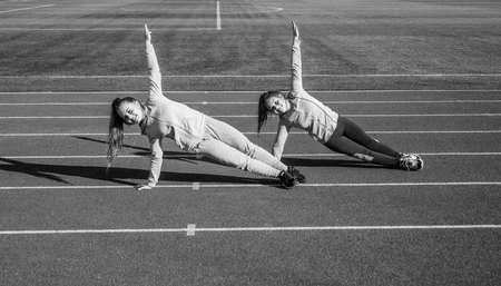 Towards the healthier lifestyle. teenage girls standing in side plank. athletes training core muscles. warming up on stadium gym. strength and flexibility. children training at school physical lesson