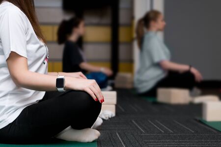 A group of young sports girls standing against a wall. time to recuperate, waiting for the start of the lesson in the loft studio, close-up. Healthy lifestyle concept
