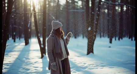 A woman in a winter setting wearing a fur coat and stylish outfit, surrounded by snow-covered trees, soft sunlight in the background
