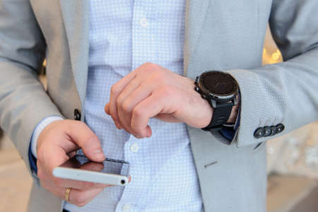 high angle man looking his watch. High quality photo