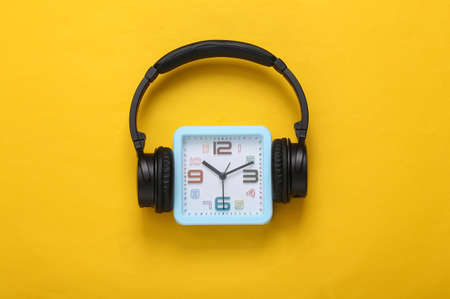 Square alarm clock with headphones on yellow background. music time. top view