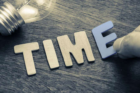 Hand arrange wood letters as Time word with glowing light bulb, Time management concept