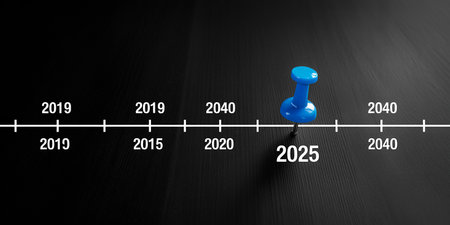 A blue pushpin is placed on a horizontal timeline with various years marked including 2025