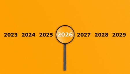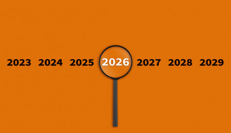 Lens, magnifying glass focusing on the year 2026 on an Orange background. Financial or stock market strategies and past and future events. Close-up