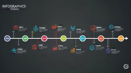An infographic displays a timeline with circular markers and connecting lines against a dark backdrop. Various icons and text labels accompany the milestones, presenting data visually. The color palette includes teal, red, and yellow accents. Suitable for commercial presentations and reports.