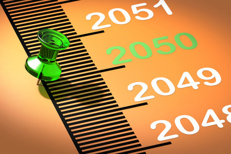 Green pin on year 2050 for Kyoto Protocol with CO2 reduction, 3d rendering