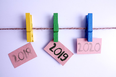 Past, present and future concept. Hanging tags of years 2018, 2019 and 2020.