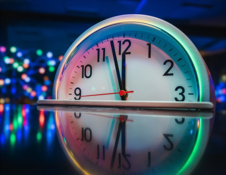 Analog Clock with Multicolored Lights on Reflective Surface in Festive Atmosphere