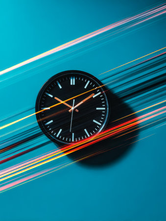 Dynamic abstract featuring a sleek circular timepiece surrounded by streaks of luminous light against a vivid blue backdrop, evoking speed and futuristic elegance.