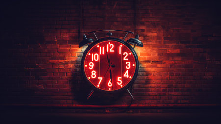 Alarm clock in neon light on a dark background with reflection.