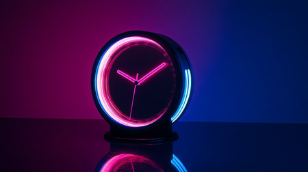 Clock in trendy neon light. Gradient pink-blue glow. Concept art. Minimalism